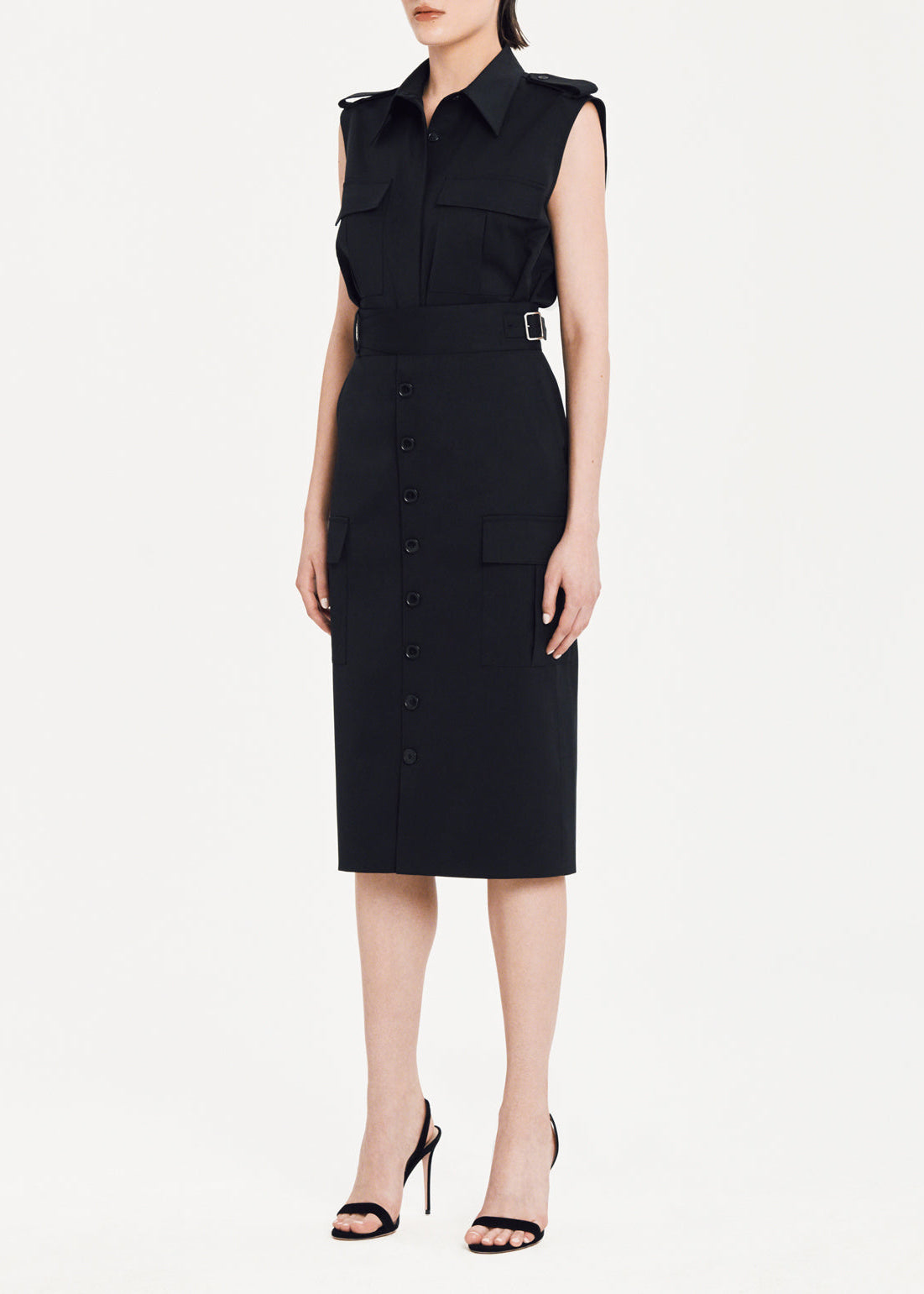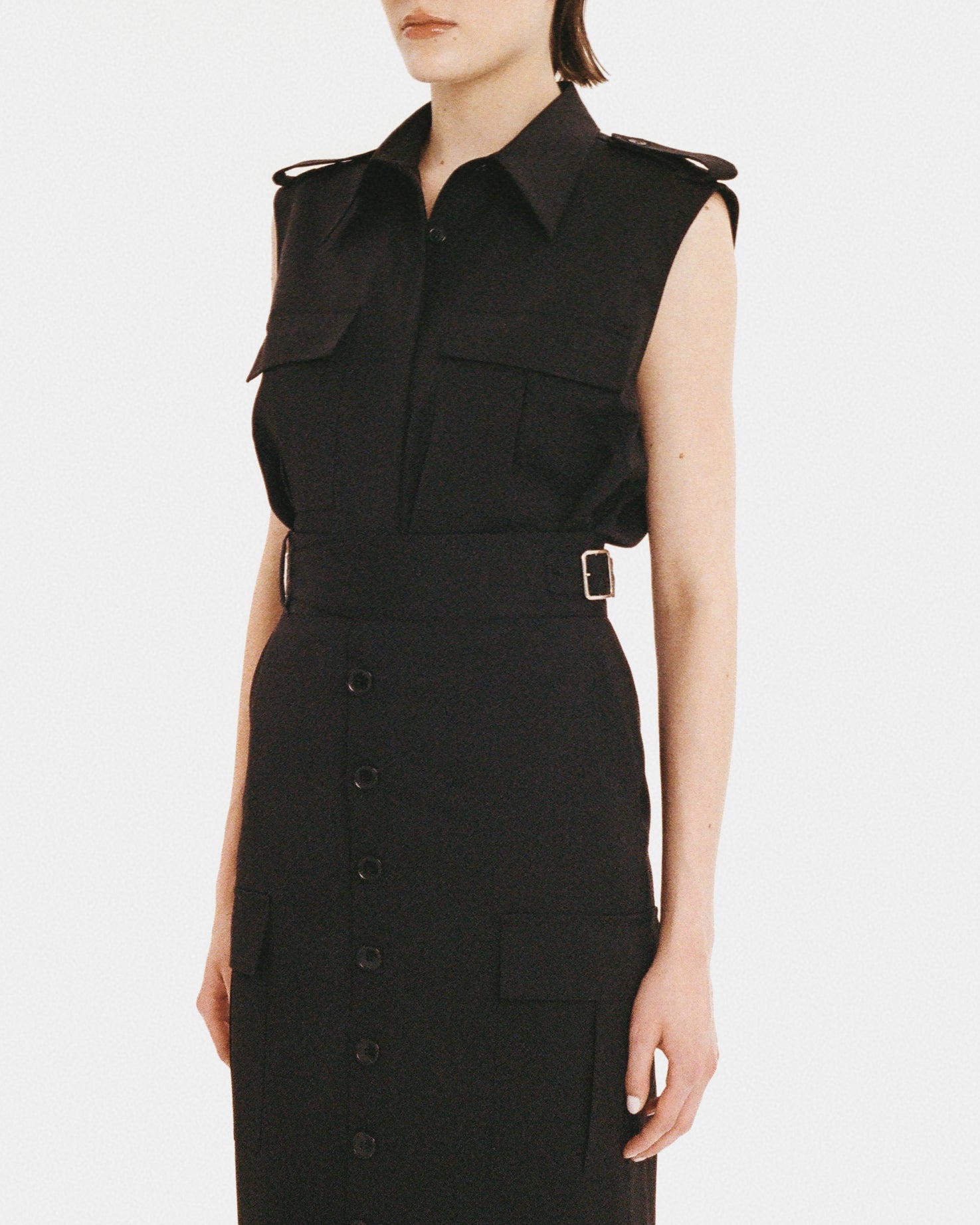 A contemporary take on utility, the Abney Shirt is crafted from CORDURA® and REPREVE® wool twill for durability with refinement. Its sleeveless silhouette is accented by shoulder epaulettes and front pockets. It pairs perfectly with its companion piece, the Calle Cargo Skirt.