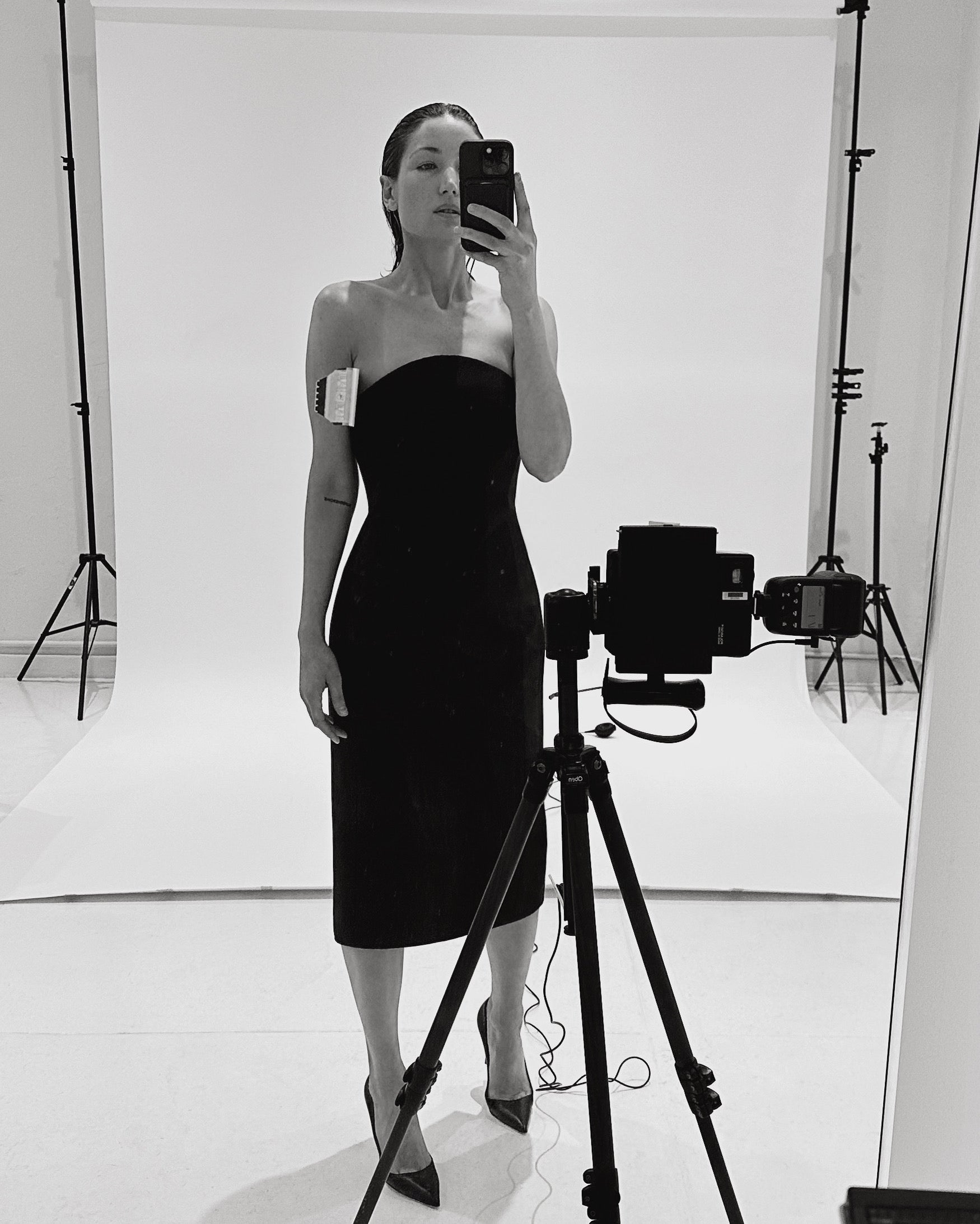 The Clisson Dress in a silk and wool blend features a structured, strapless neckline with a dramatic curve and a center back slit. The silhouette is completed by long, slimming seams and an invisible back zip.