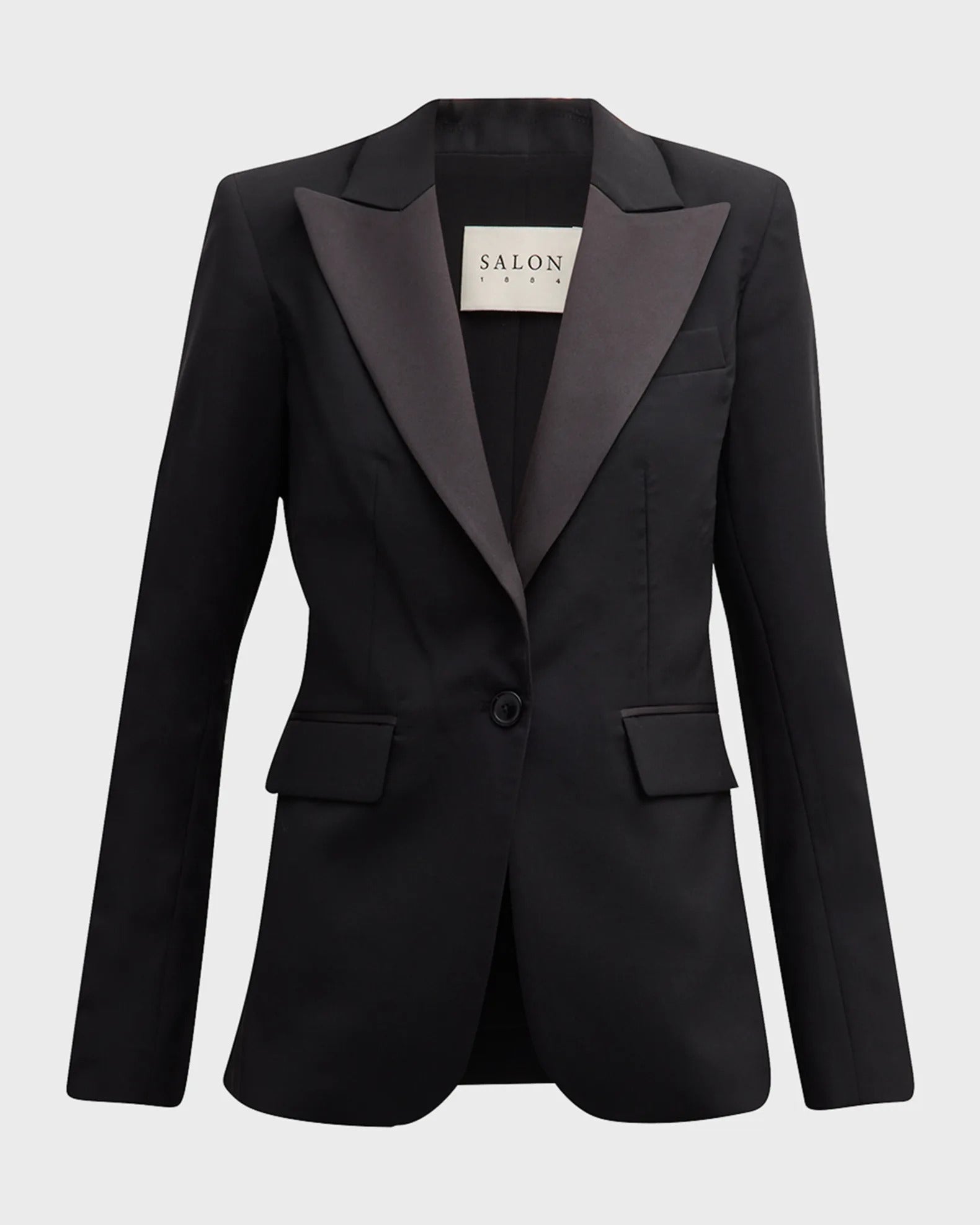 The Lou Jacket in smooth silk-lined wool is a single-breasted tuxedo style jacket, complete with satin lapels, button cuffs, a chest welt pocket and satin-trimmed side flap pockets that come together for a simple and theatrical look.